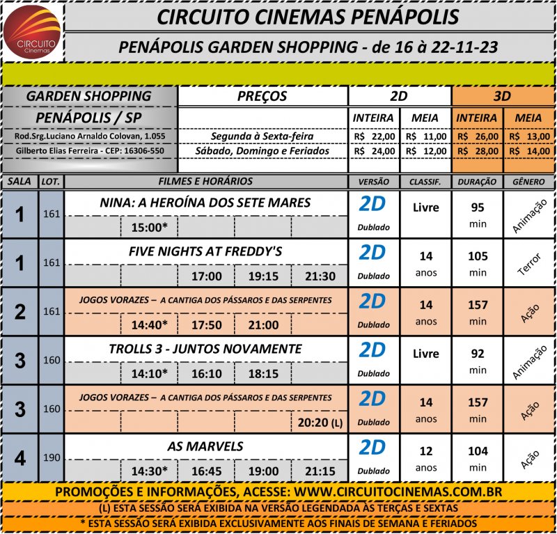 Um dos filmes mais esperados do ano, "Jogos Vorazes - A Cantiga dos Pássaros e das Serpentes" já está nas telas do cinema de Penápolis, no Garden Shopping. O longa é dirigido por Francis Lawrence, que também assina a direção dos três últimos filmes da franquia (“Jogos Vorazes - Em Chamas”, “Jogos Vorazes: A Esperança - Parte Um” e “Jogos Vorazes: A Esperança - O Final”).