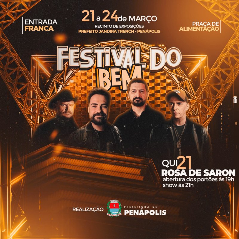 Está tudo pronto para o “Festival do Bem” que começa hoje (21) em Penápolis e vai até o dia 24 (domingo), com shows gratuitos para a população da cidade e região. O show de abertura será com a banda Rosa de Saron, conhecida nacionalmente por ser uma das precursoras do rock cristão. A abertura dos portões do Recinto de Exposição “Prefeito Jandira Trench” será às 19h e o show do Rosa de Saron está previsto para iniciar às 21h. O endereço é rua Luiz Cremonini, 101 - Parque Industrial.