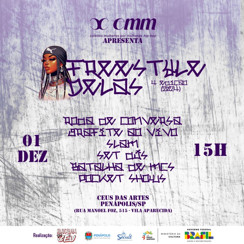 A Secult – Secretaria Municipal de Cultura e Turismo convida toda comunidade para prestigiar a 4ª edição do evento cultural “Freestyle Delas”, que acontecerá neste domingo, 1º de dezembro, a partir das 15h, no CEUs das Artes (Rua Manoel Foz, 515, Vila Aparecida). Entrada Franca. Em sua quarta edição, o evento cultural propõe um dia repleto de atividades, incluindo roda de conversa, palestra, batalha de MCs, slam, set de DJ, grafite ao vivo e pocket shows, tudo protagonizado por mulheres e pessoas trans. O “Freestyle Delas” é uma iniciativa criada por Jeferson Alves, o “Big G”, d [...]