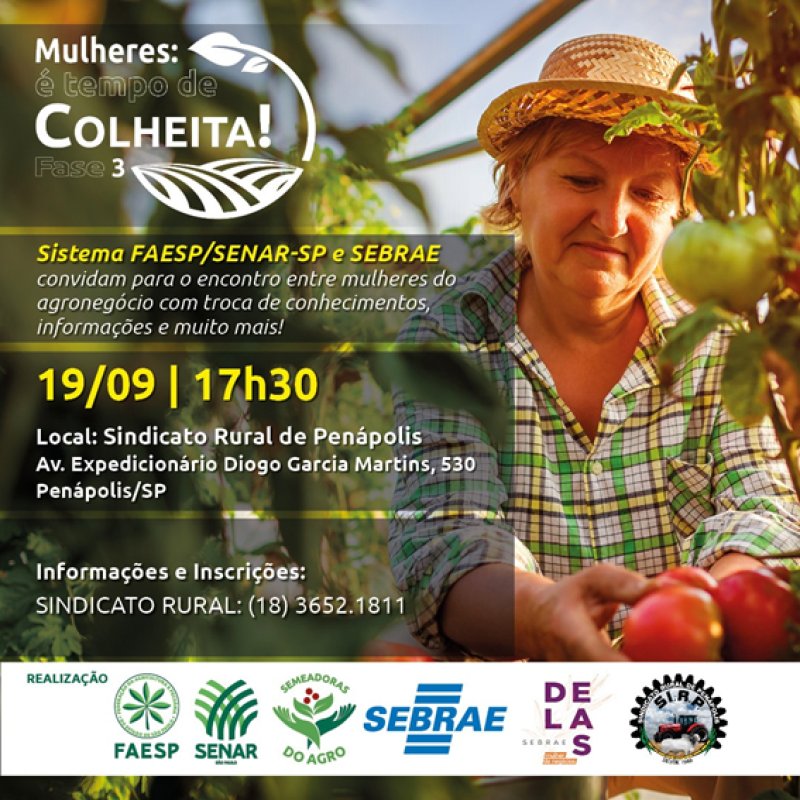 A cidade de Penápolis receberá no dia 19 de setembro, a partir das 17h30, a terceira fase do programa “Mulheres: é tempo de Colheita!”, uma iniciativa do Sistema FAESP/SENAR-SP em parceria com o SEBRAE-SP. O encontro, que acontecerá no Sindicato Rural de Penápolis, localizado na Avenida Expedicionário Diogo Garcia Martins, 530, tem como objetivo fortalecer a presença feminina no agronegócio, incentivando o protagonismo das mulheres do campo por meio de capacitação, orientação e momentos de inspiração.